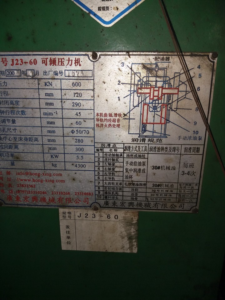 开式可倾压力机(J23-60)一台、开式双柱可倾压力机(J23-60)一台、开式双柱可倾压力机(J23-30)四台、开式双柱可倾压力机(J23-25)两台。存放于阳江市阳东区东城镇裕东一路59号阳江市阳东金时代实业有限公司内。